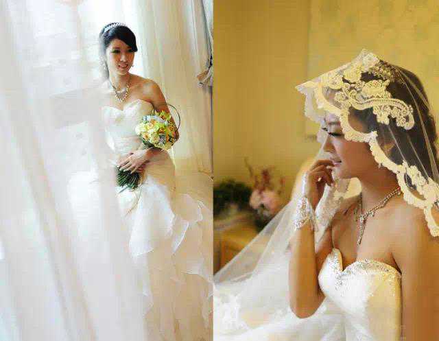 在室内,光线的把握尤为重要。这时候一扇大窗户就成为了室内重要的光源。可以让新娘站在窗前,拉起薄纱窗帘,让窗子成为一个巨大的柔光箱,太阳光通过薄纱后的光线撒在新娘身上,形成十分理想的漫反射软光。窗前的一个高调逆光,新娘背后的窗子完全陷入了高调过曝之中。