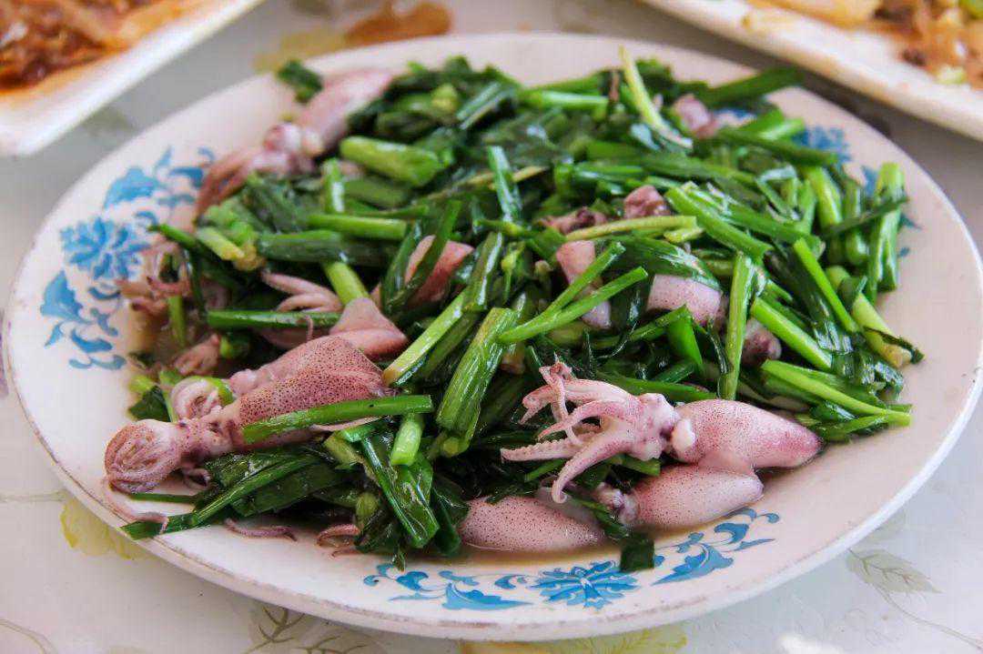 ▲韭菜炒海兔子。海兔子是北方沿海地区对小鱿鱼的一种俗称。图/视觉中国