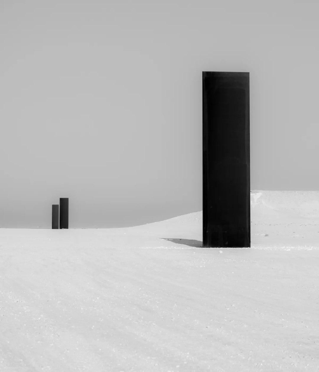 在卡塔尔的沙漠中伫立着的是Serra和他的雕塑作品《East-West/West-East》(2014)。四块钢板被垂直插入地面,在广袤的沙漠中,创造出和人、自然之间非常奇妙的尺度关系。下图摄影:SophieGladstone