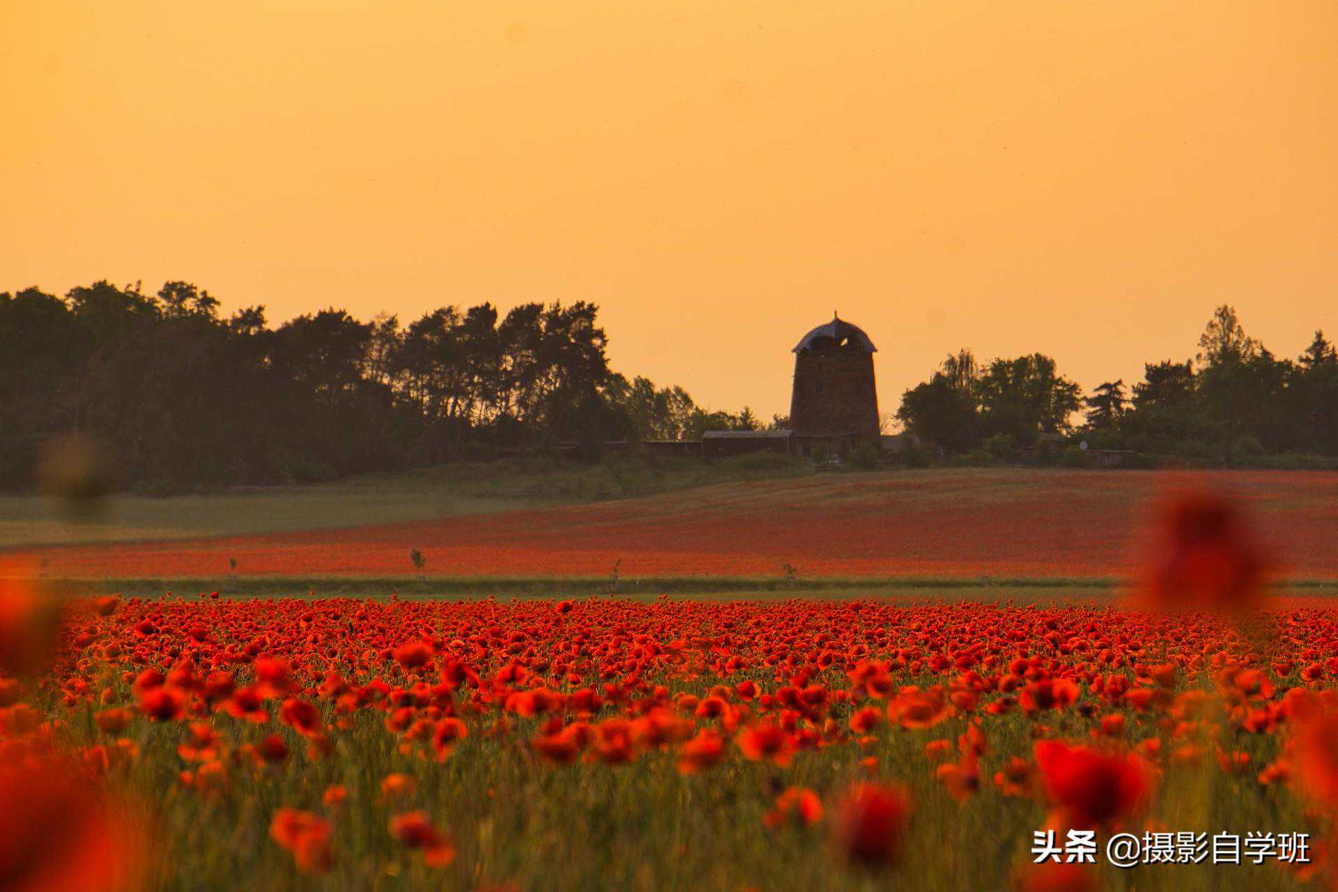 照片想要拍出层次,另一个方法是拍出前景。上图首先远景的天过曝了,有前景但层次感没出来。想拍拍出有层次感的前景,可以像下图这样,机位低一些,花遮挡镜头,有虚化,这个角度的前景,层次感就来了。
