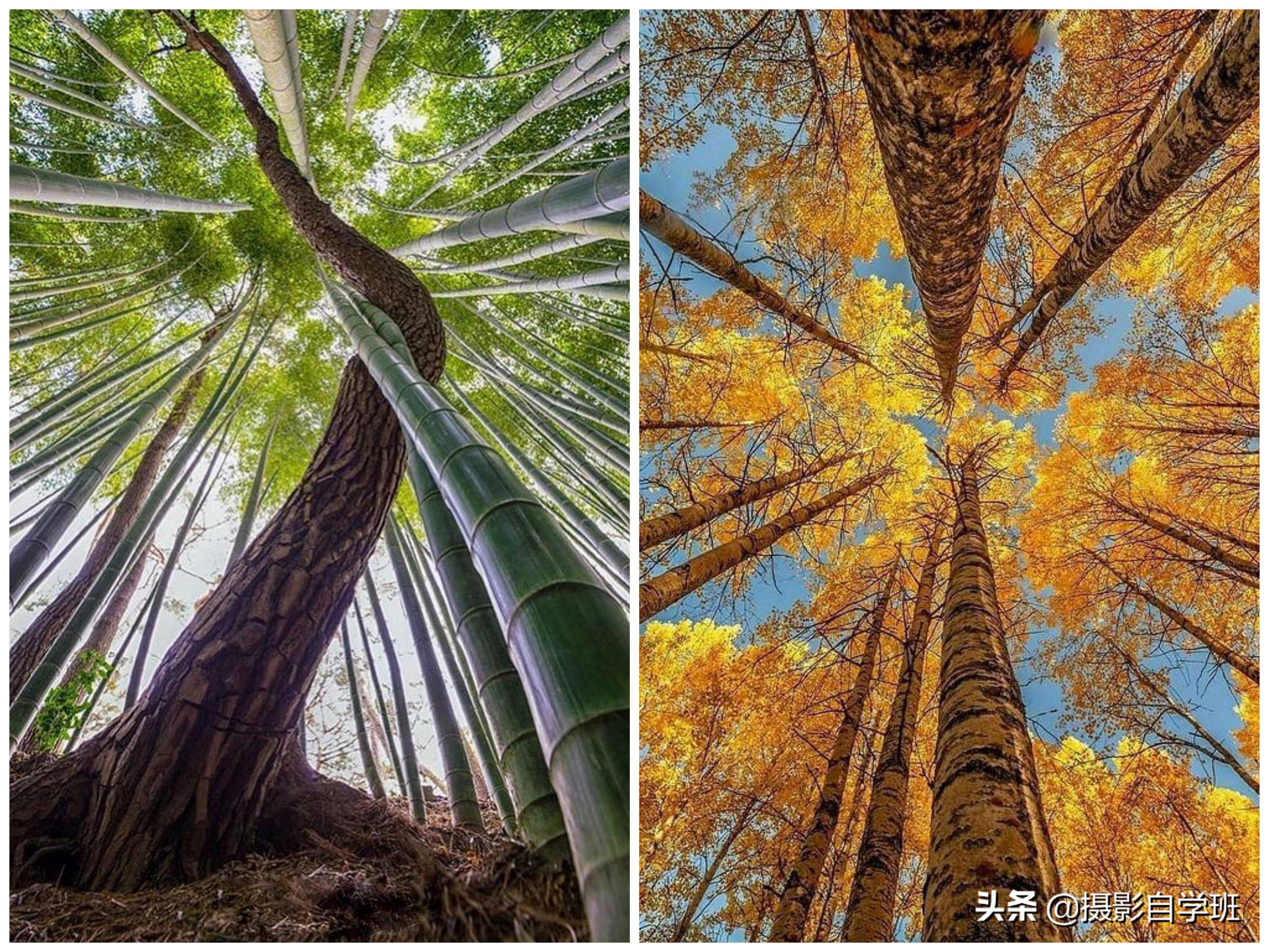 角度在摄影当中非常重要,拍摄风景的时候,你要选择有创意,有震撼力的角度,比如顺着竹子或者顺着树干,从下向上仰拍,有的时候需要垂直仰拍。但不只是向上拍就可以了,还有另外一个重点,要顺着树干,比如竹子这张,顺着竹子,比如上图右侧这张,在两个树干中间,画面非常对称,这样照片才能更好看。
