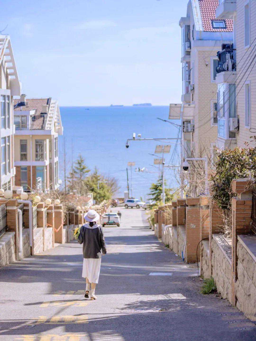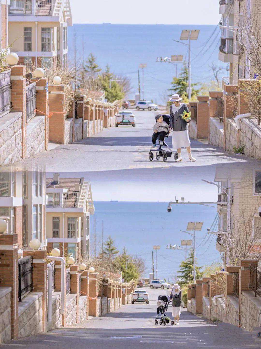 小路坡度很大,站在路口一眼望去就能直通大海,有波光粼粼的海面做背景,每一帧画面都泛着耀眼的光。