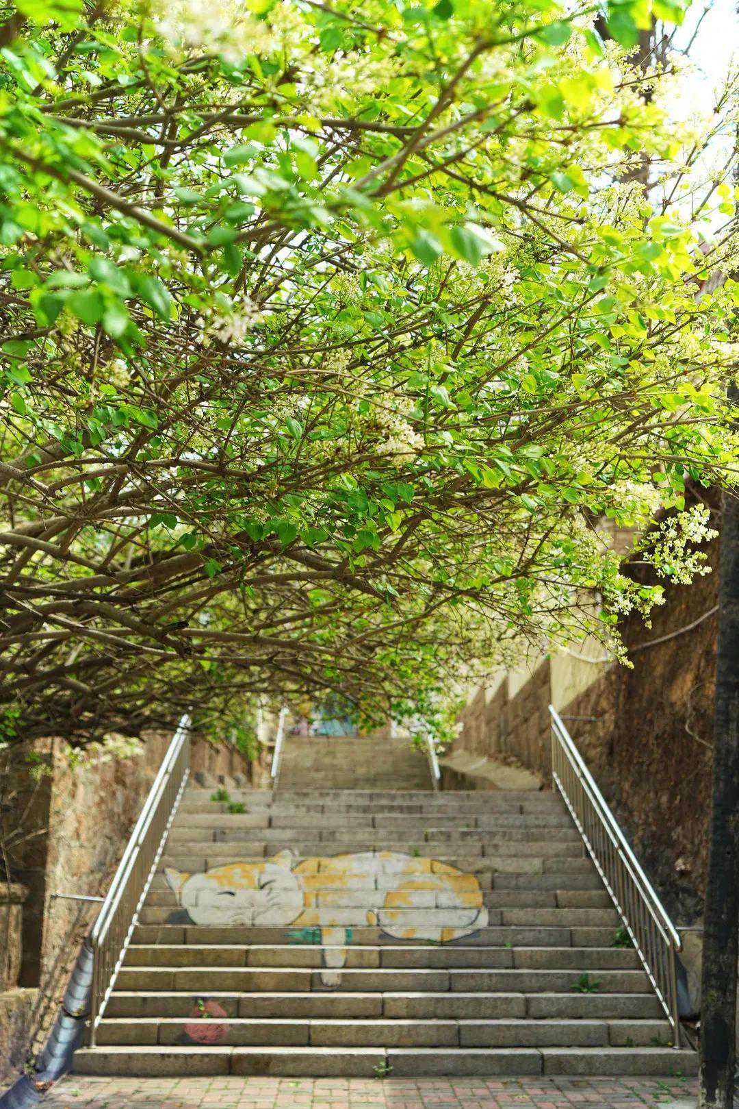 金口路是名人故居的聚集地,沿路有许多老房子和丁香树,从金口三路1号甲下阶梯,你会发现一只卧倒在台阶上的大猫咪,一切仿佛是动漫里的场景。
