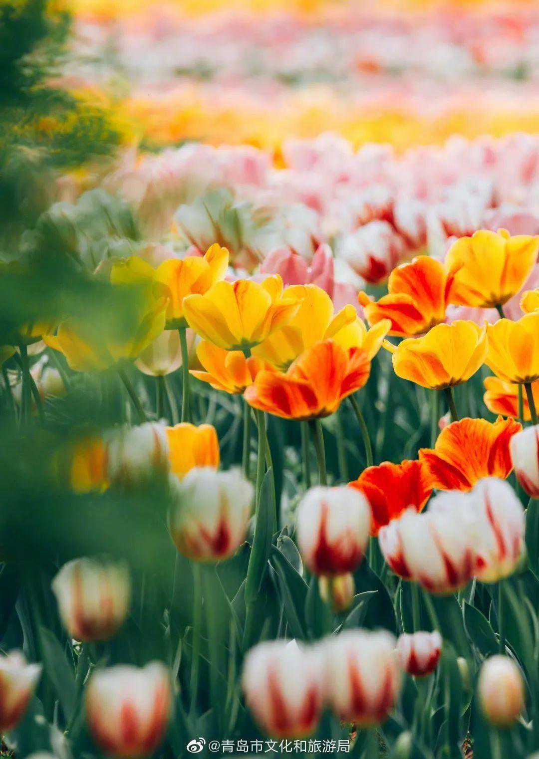 湛蓝的天,纯洁的云,阳光和微风都是温柔的,花丛开得十分密集且热烈,冷暖色调交错呼应,当奶油色滤镜与鲜艳的郁金香相遇,春日氛围感瞬间爆棚。