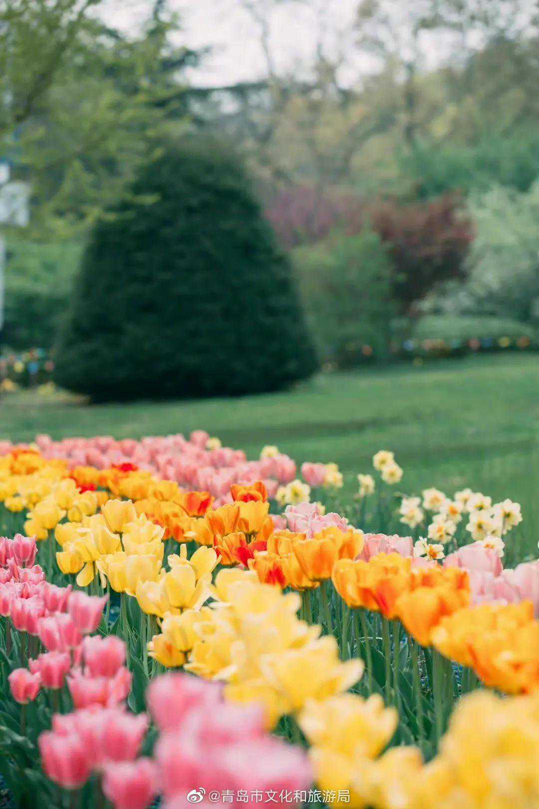 相比人潮拥挤的青岛中山公园,湛山寺旁的青岛植物园则是一个人少景又美的宝藏出片地,不仅花海繁盛,而且出片的机位很多,可以尽情拍个够。