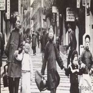 这是二十世纪初的时候,香港的街道上,这个小女孩牵着的男孩身上穿的是外国小孩穿的衣服