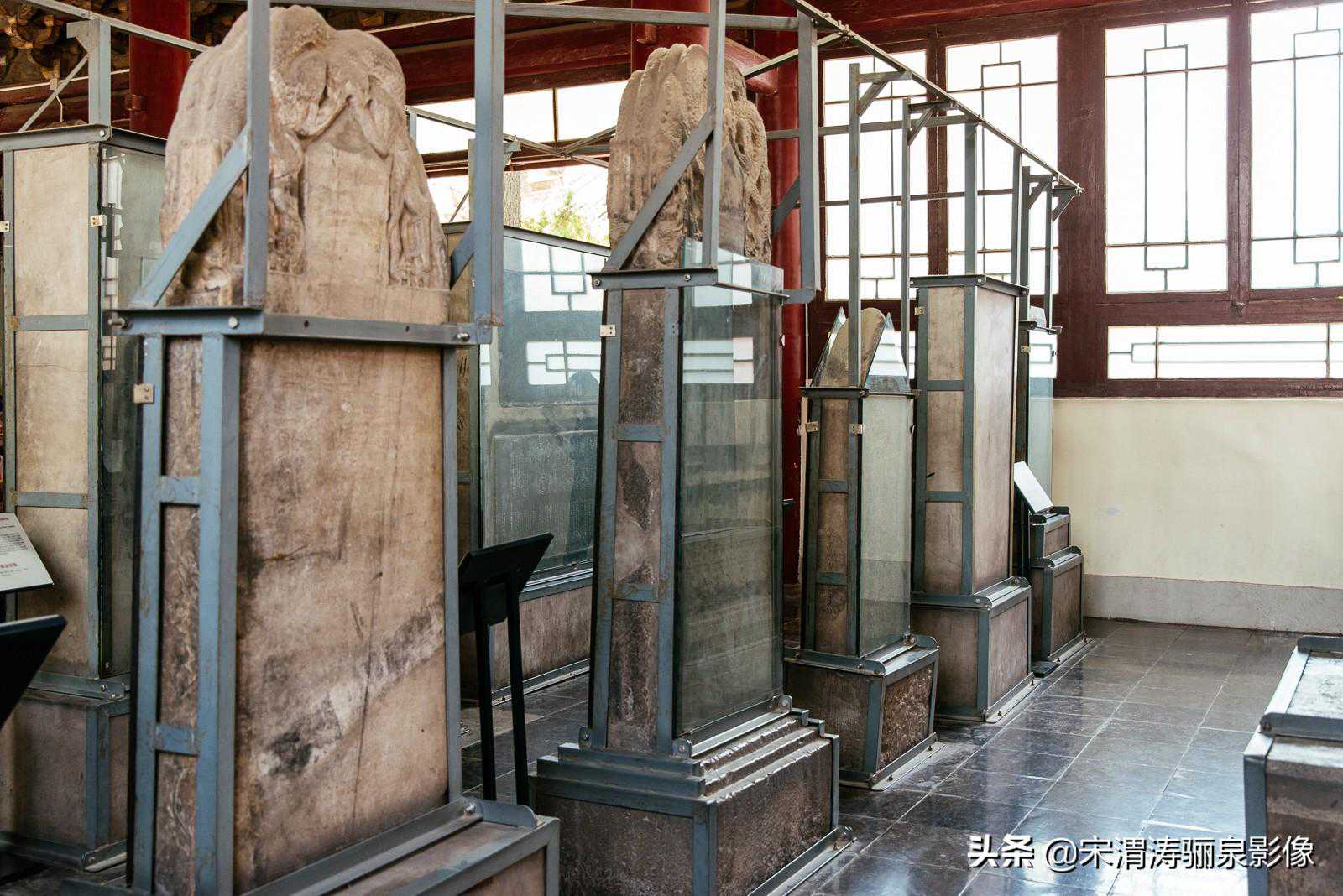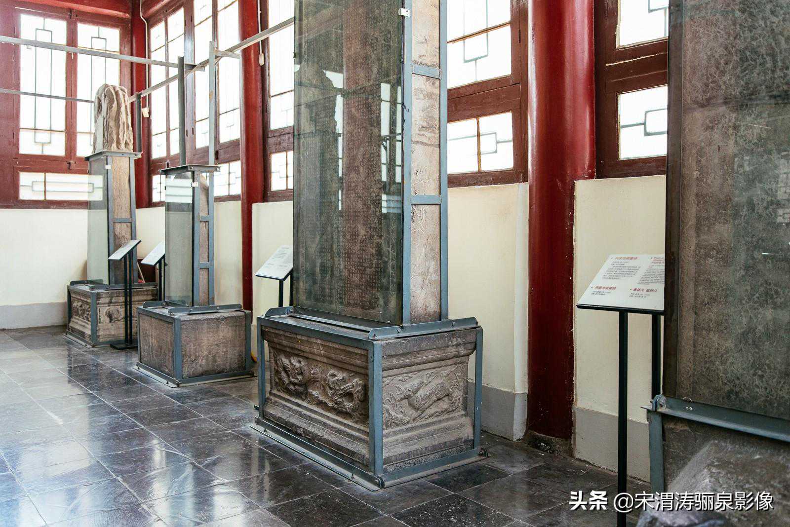 走过碑亭的大院,就来到了碑林的主要陈列地,陈列由碑林、石刻艺术和其它文物展览三部分组成,共12个展室,碑室7座、碑廊8座、碑亭8座,加上石刻艺术室和4座文物陈列室,陈列面积达4900平米。我主要参观了第一、第二、第三展室、拴马桩、石刻艺术展览。