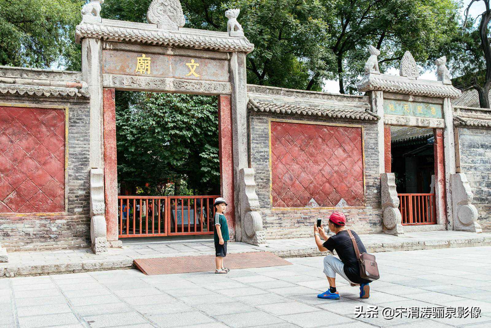 在观看了蓝天白云下的牌坊后,我在泮池边细致拍摄了一会,以棂星门作为主体,以泮池及栏杆作为前景,拍摄了蓝天白云下的棂星门,且偶遇一队爷孙,为他们留下的美丽的旅游纪念照。