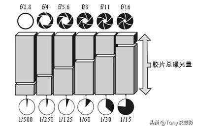 是指曝光量一定时,光圈、快门速度和感光度互相调整,在一个参数降低X倍的曝光量,其他两个参数要同时增加X倍的曝光量,达到曝光总量不变,效果不同的目的。如下图所示。