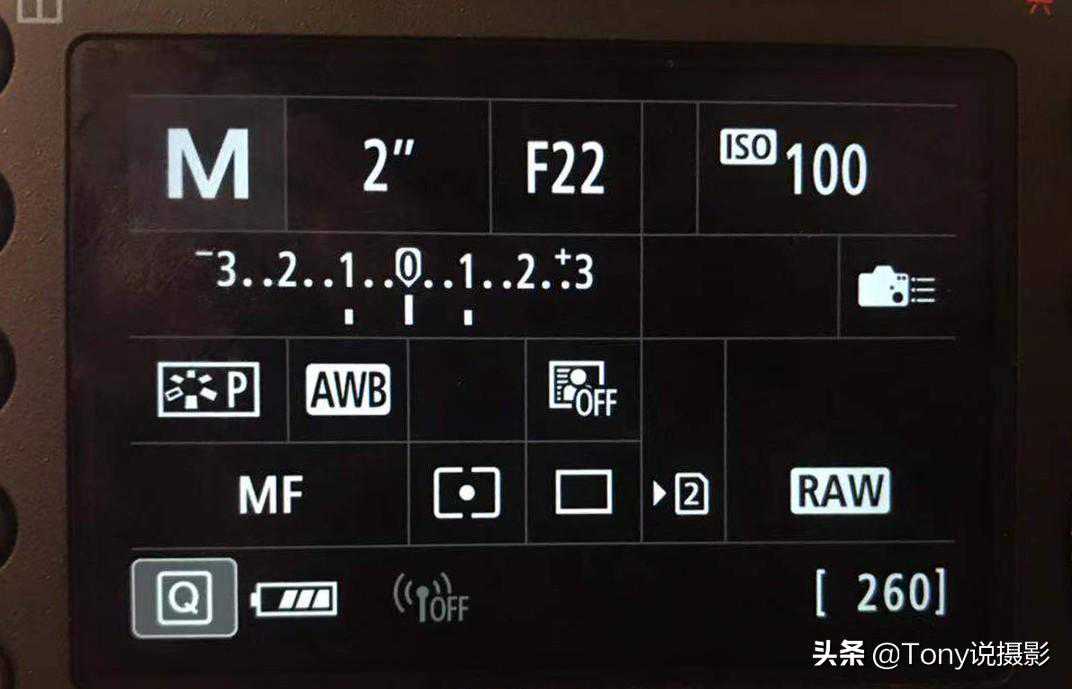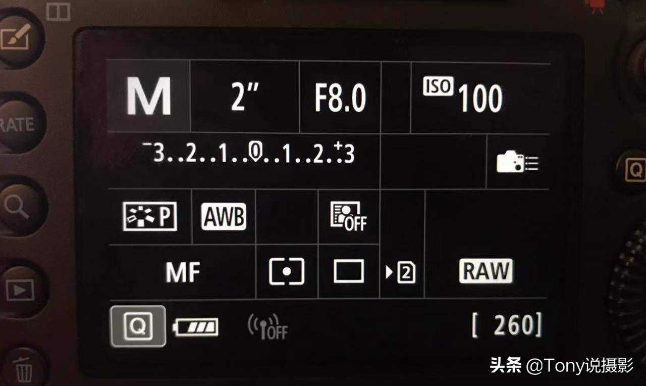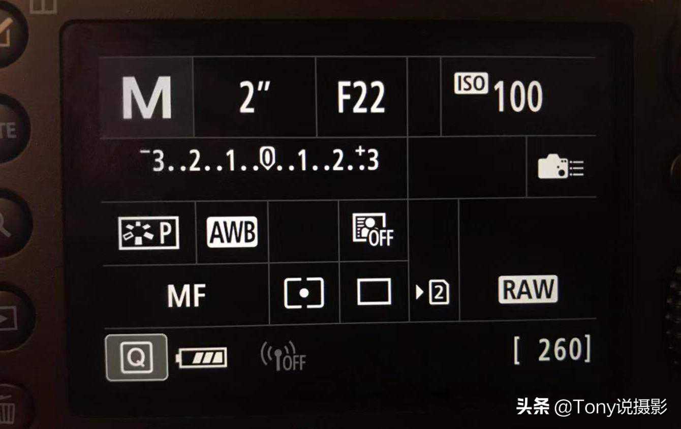 (3)拍摄慢门需要较慢的快门时,将快门调到2"。曝光量增加了8档,所以快门感光度要降低8档曝光量。