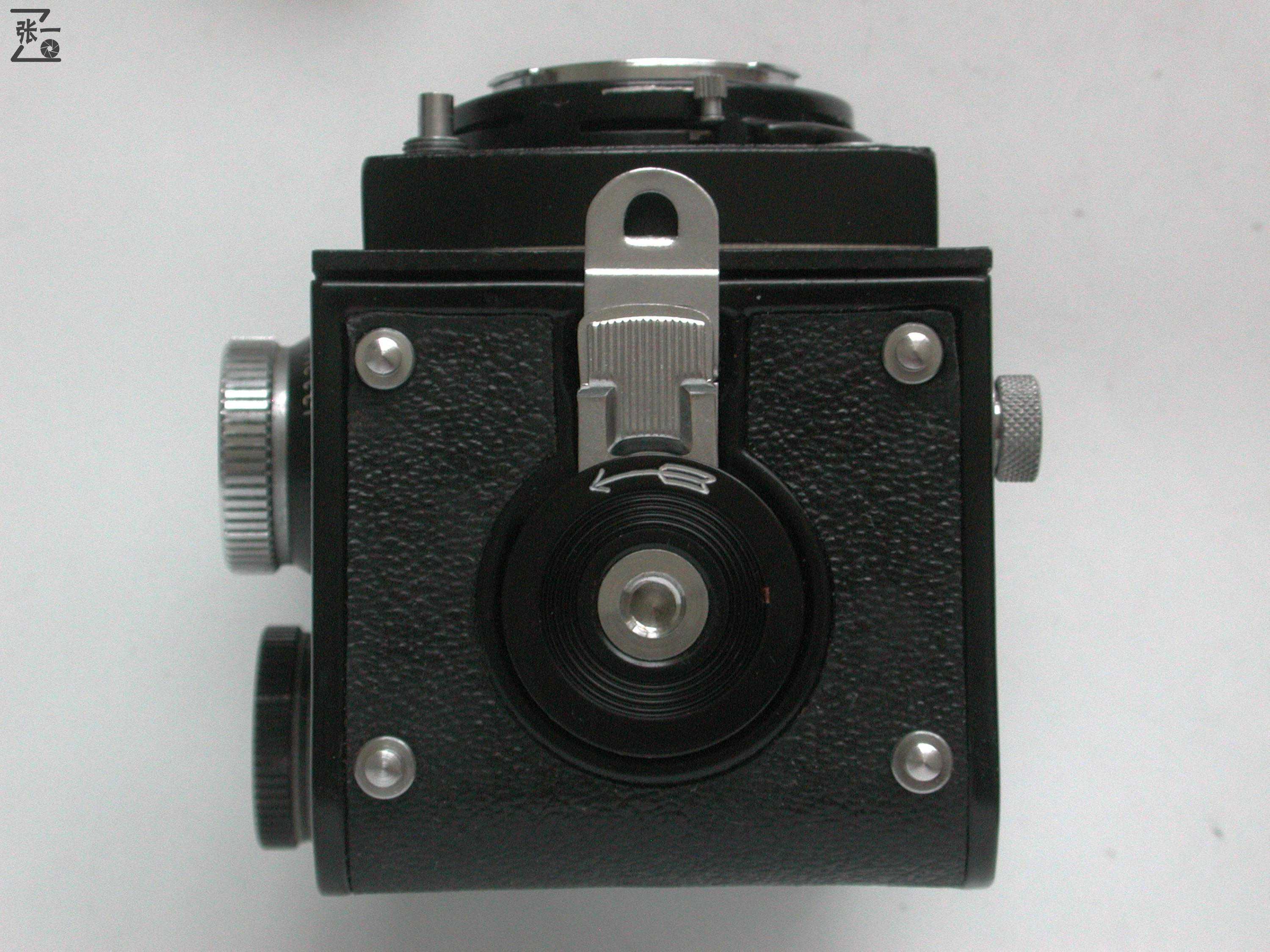 这款双反相机上面的各种扳手比较多,其中在两个镜头中间的左右两侧各有一个扳手:右侧的是闪光模式选择开关,左侧的则是快门扳手。话说中间的哪个Walz公司的标识好像有点小吧?摄影镜头下方的则是机械自拍上弦扳手。