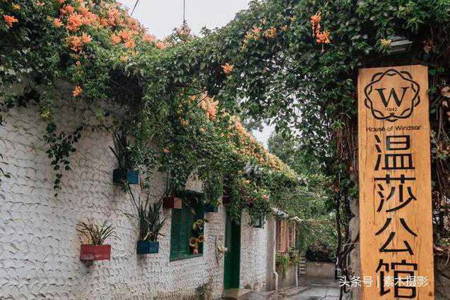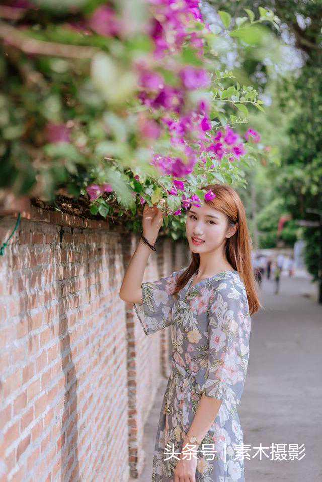 船屋左边红墙上种满三角梅,模特可靠近三角梅,拍摄者居高相机,用三角梅作适当前景拍摄。