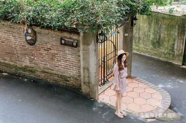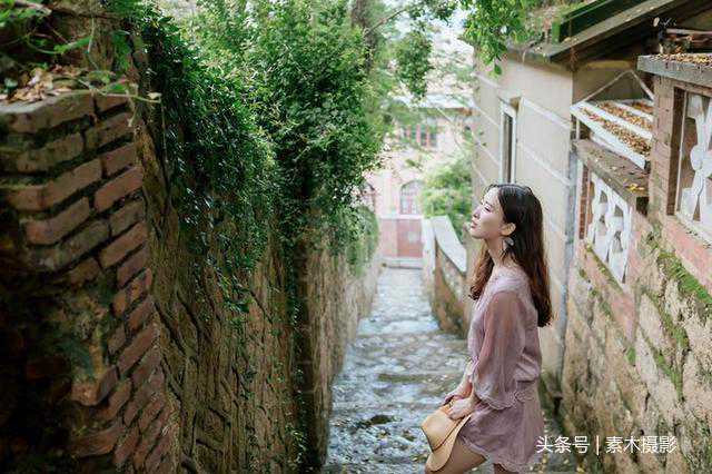 正面拍摄容易拍到两旁路人,可爬石阶上左边高墙,拍摄者采用俯拍,船屋取3/4景,模特放右边平衡构图。