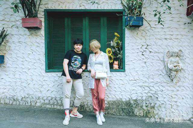 模特上墙,如是2人以上出行,可一人一边对称构图拍摄,单人出行可正面拍摄。