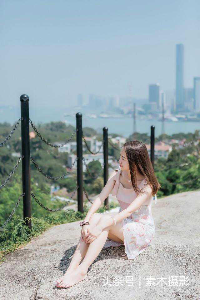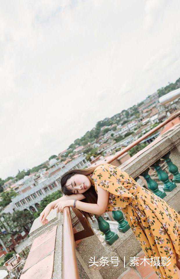 栏杆较丑避免入镜,可用模特背靠挡住,拍摄者居高相机俯拍,即可取景模特和身后的鼓浪屿全景。