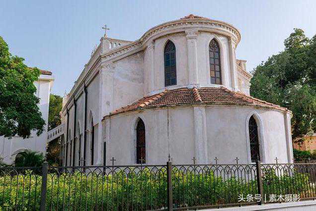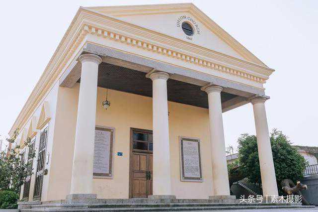 游人较多时可让模特坐在礼拜堂右侧长凳上,拍摄者仰拍即可取景整个建筑又避开部分游人。