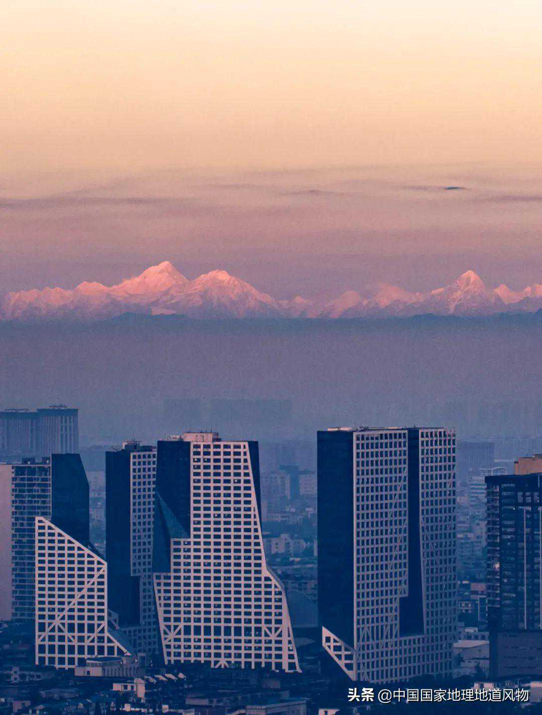 一方面由于群山阻隔,冷空气抵达成都时已为强弩之末,降雪也不过是零星的“头皮雪”。另一方面,在天朗气清时,成都人往往身处城市之中就能与雪山同框:海拔7556米的“蜀山之王”贡嘎山、海拔6250米的四姑娘山幺妹峰、海拔5353米的成都境内第一高峰大雪塘……