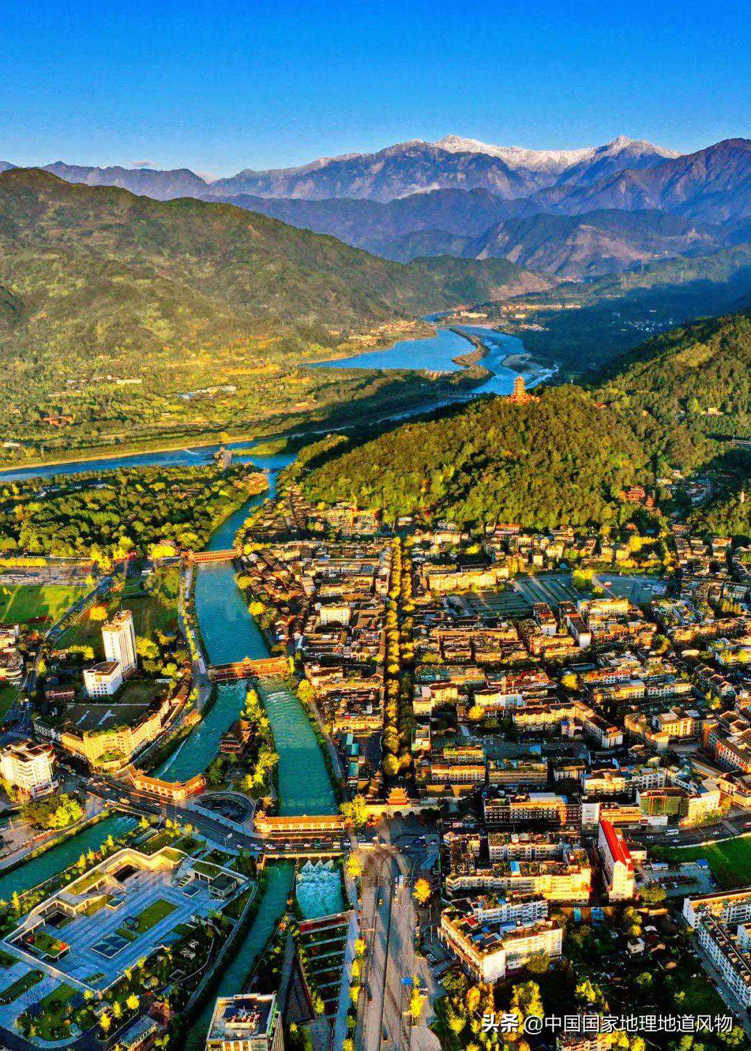 当雪山上的冰川消融,汇集成流,以极大的落差冲出峡谷,形成了汹涌浩荡、喜怒无常的岷江、沱江等河流,河水裹挟着泥沙碎石,逐渐在山前沉积成厚重开阔、水网密布的平原,是为成都平原。