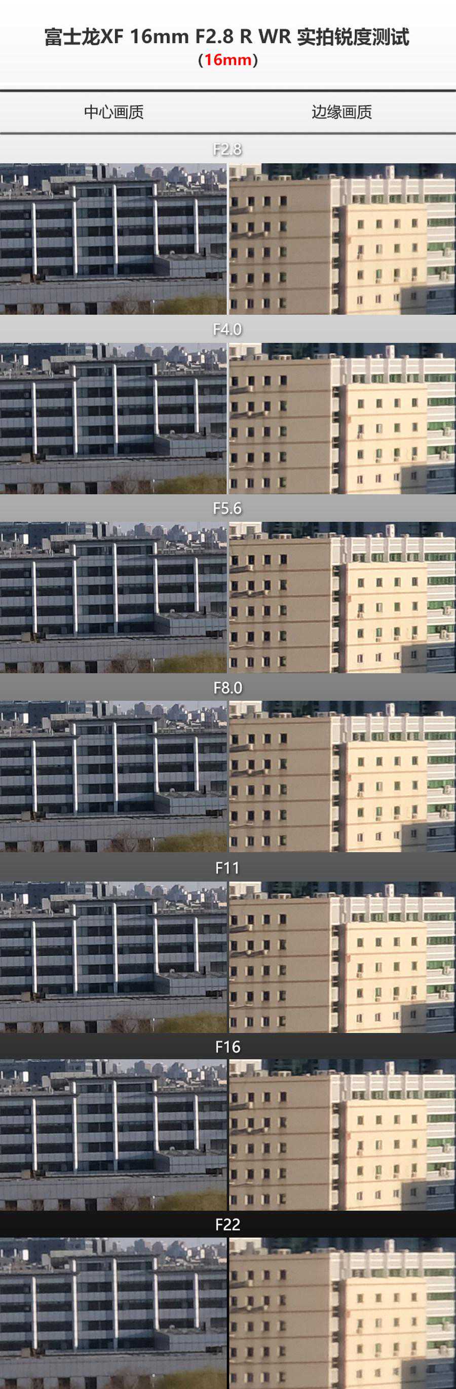 从实拍的测试截图来看,富士镜头在下无论是中心还是边缘画质表现都还不错,完全在可用范围内,但当光圈收缩到时即能感受到明显的画质提升,随着光圈逐级缩小中心与边缘分辨率进一步提高,光圈在时画质稳定在较高水平。由于镜头衍射问题,光圈收缩至F16后开始下降。作为一支大光圈广角定焦镜头的表现还算令人满意,在F16小光圈下仍然保持了不错的画质,对于喜欢外出拍摄风光的摄影爱好者来说,既小巧轻便又具备一定画质表现的镜头应该具有不小的诱惑力。