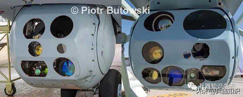 卡-52M的光电转塔,从下图左侧卡-52的GOES-451换成了下图右侧的GOES-451M。从远处看棱角更加分明,从正面看可以发现光电设备的物镜端口更多,中间多了1个,最下方多了2个。