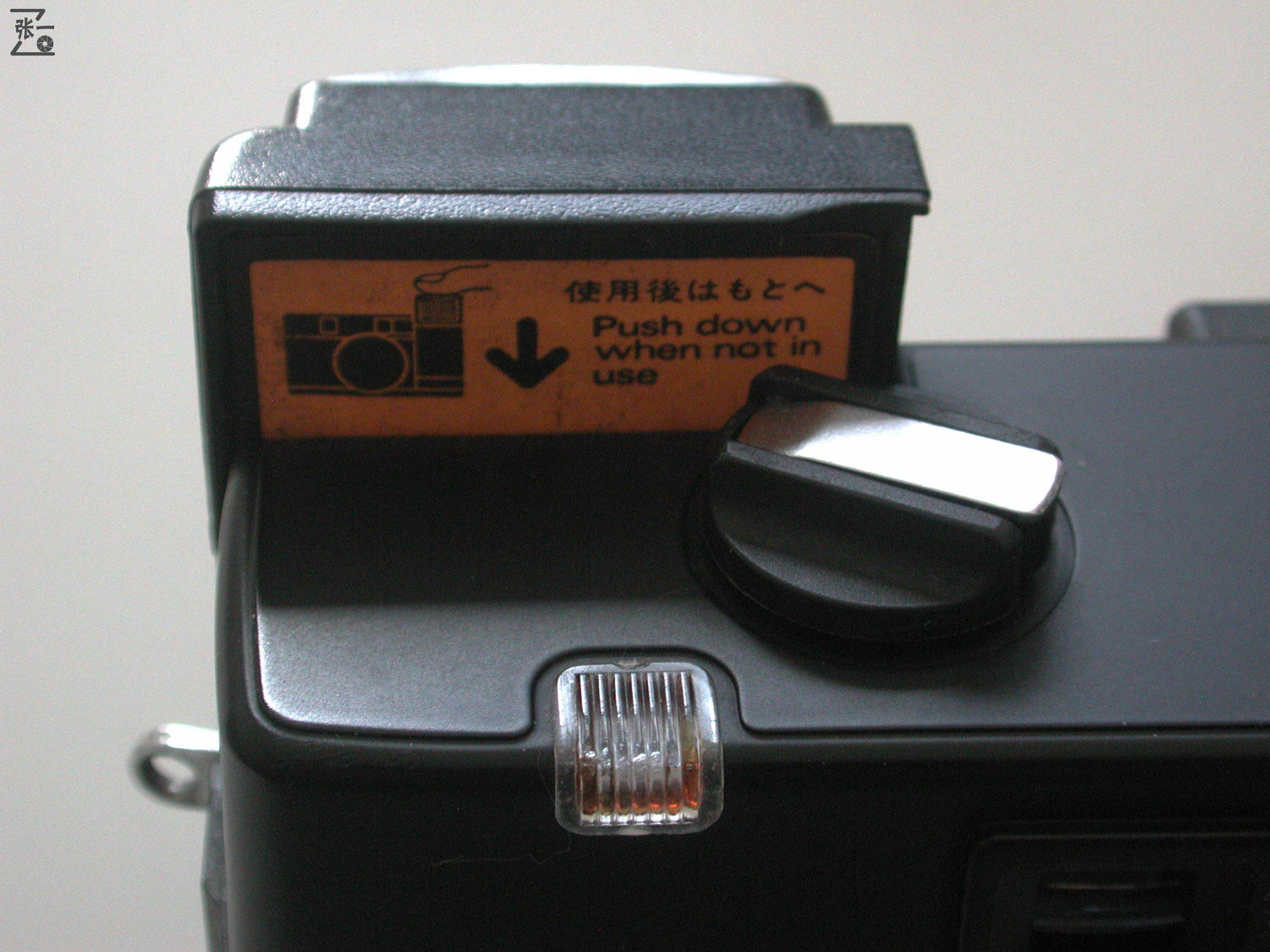这款KonicaC35AF的镜头盖设计也非常有趣,是与用于对焦的两个测距窗口的保护盖合为一体的,非常像英文字母“T”。我个人估计采用的设计,其主要目的还是为了保护该机的自动对焦系统。毕竟是世界上首台具备了这样功能的照相机。但有一点我觉得很奇怪,这台相机的机身上并没有任何产地标识,倒是镜头盖和原装的相机套上有Japan的字样。