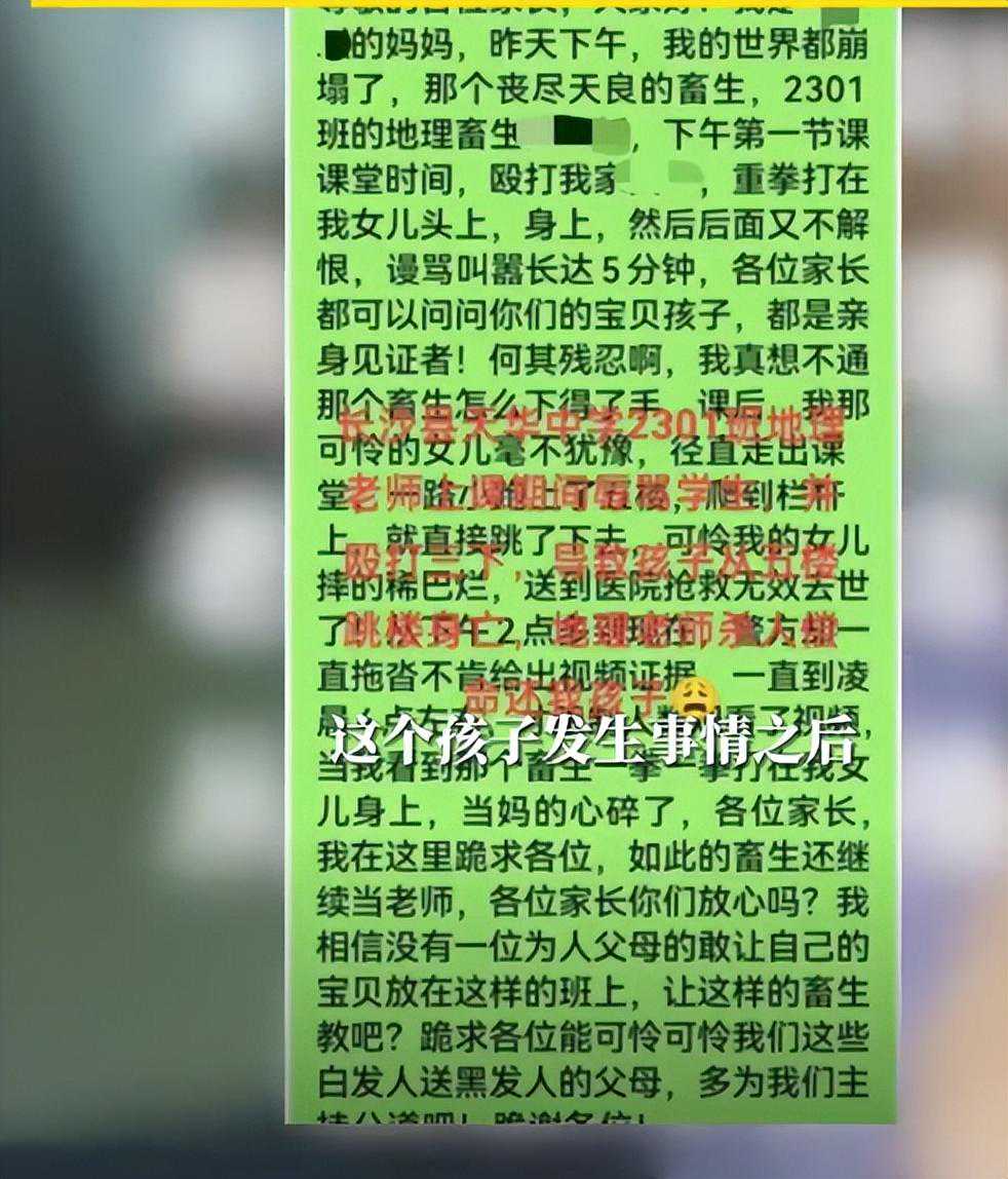 根据该学生家长发布的内容显示,他的闺女在昨天下午第一节课课堂上被地理老师殴打,一边殴打一边谩骂,时长长达5分钟。地理老师殴打之时,也不管是什么部位,不管是头上还是身上,一拳一拳的不停击打。导致她的女儿无法忍受精神与身体的双重伤害,径直走出课堂,一路小跑上了五楼,爬到栏杆上就直接跳了下去。