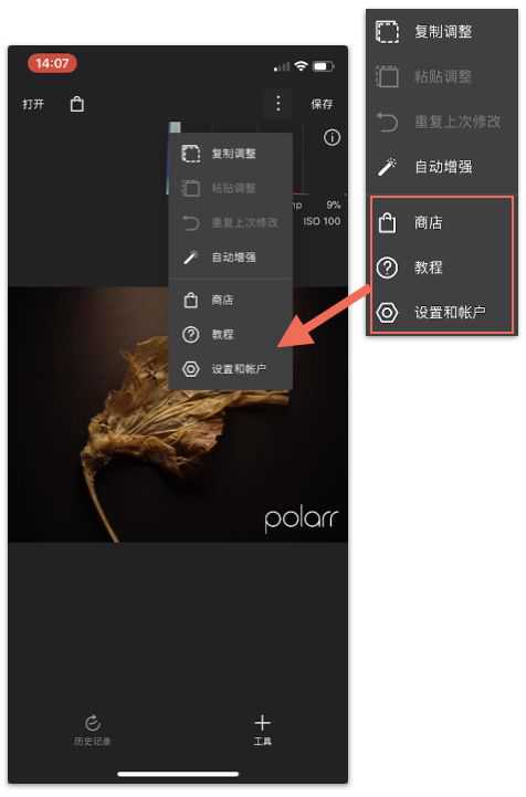 和很多App一样,泼辣修图右上角的三个小圆点代表了更多选项的意思。