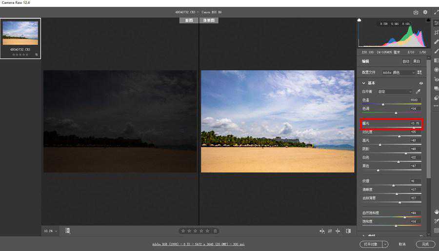 通过AdobeCameraRaw软件调整后对比,曝光+3.5EV