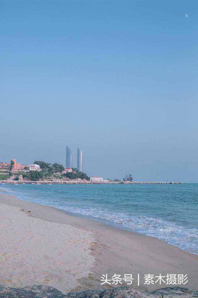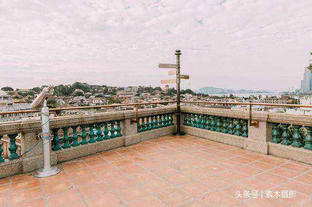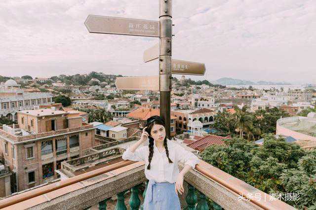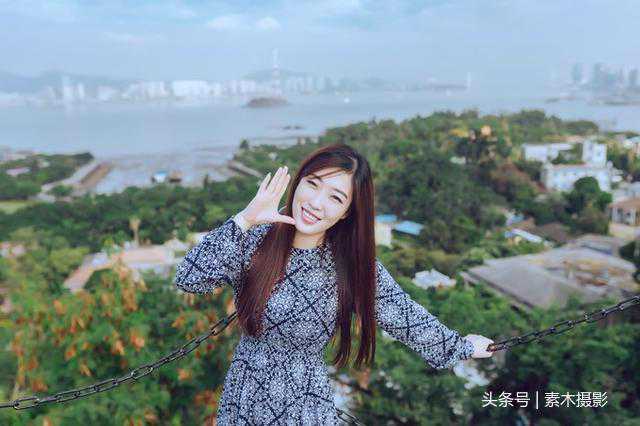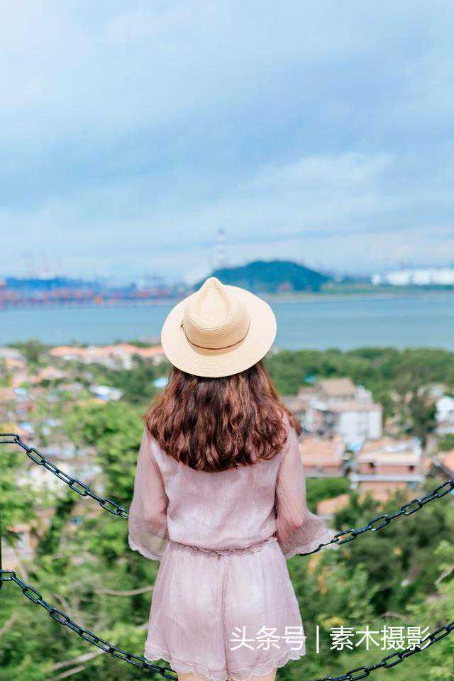 栏杆较丑避免入镜,可用模特背靠挡住,拍摄者居高相机俯拍,即可取景模特和身后的鼓浪屿全景。