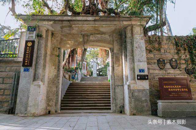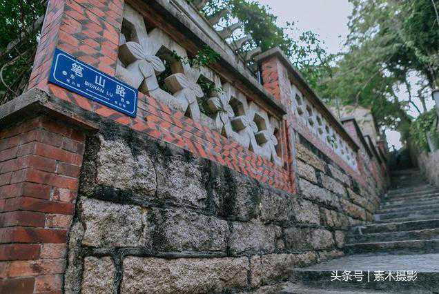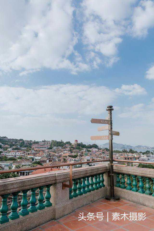 取景有路牌的角落,镜头居高即可拍到鼓浪屿俯视背景。