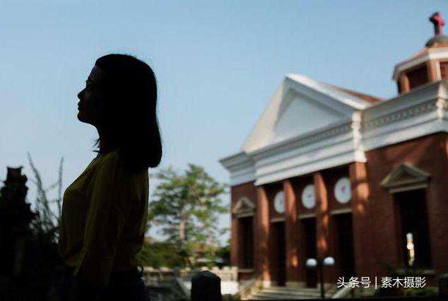 如遇大太阳,可测光强光下的三一堂,模特站于阴影处,拍摄侧身剪影。