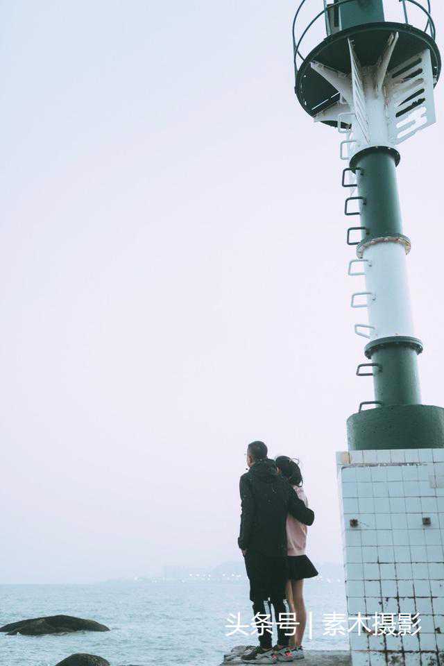 沙滩上有一个灯塔,可作为取景,涨潮时作为背景,拍摄者把模特放在画面右侧,灯塔放在左侧形成对称构图。