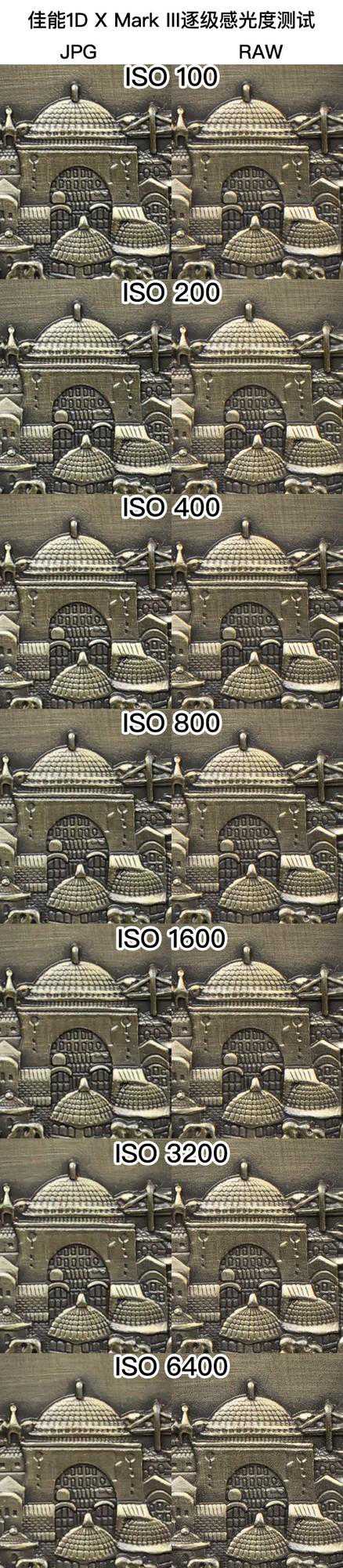 接下来,我们来看一下佳能1DXMarkIII的实际测试。先来说机身的画质表现,这台相机的原生感光度为ISO100-102400,可以通过扩展感光度达到819200的超高感光度。下面我们就来看下相机的实际高感表现。由于感光度范围非常大,我们先来看下ISO100-6400的画质表现。