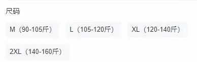 共有M--2XL共4个尺码,每个后面都有对应的体重,上身比较胖的MM可以选择大一码哦~