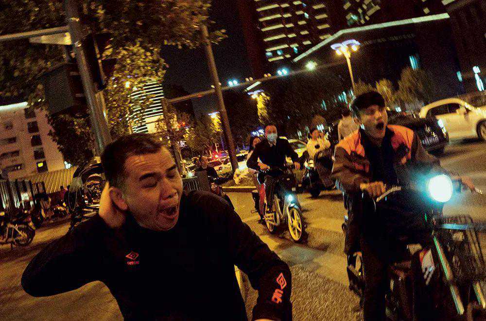 刘涛想起每天扫街时,在合肥最高档的商场银泰中心外,总有一群外卖员在等活儿。巨大的奢侈品LOGO墙在夜里像钻石一样闪烁,那些外卖员远远地排成一排,都在电瓶车上躺着,每个人都面无表情地刷手机,一个单子来了,立刻起身发动电动车,飞快地窜到马路上。