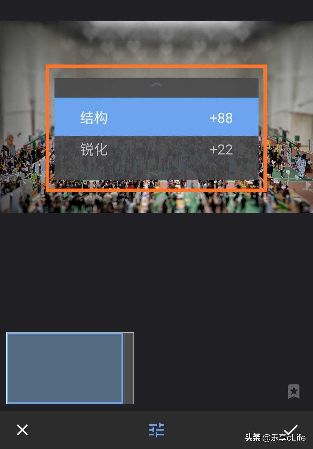 切换成线层式后我们要调节它的位置和模糊范围,双指在上下两横线处向中间滑动可以缩小模糊范围,反方向可以放大,而按住中间的蓝色小圆点可以移动它的位置。