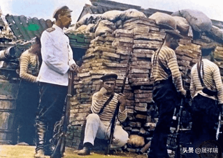 照片拍摄于1900年,在北京城东交民巷设置路障的沙俄帝国士兵。