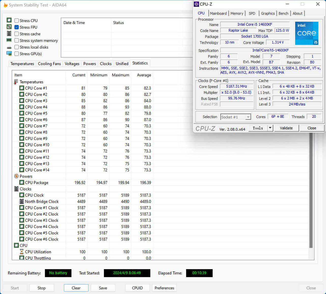 测试采用AIDA64进行FPU单烤(风扇调至UHS档,且关闭PWM功能,室温20.2-20.3℃)10分钟,Clear前5分钟的温度,并记录第5到10分钟之间的P核和E核温度平均值。