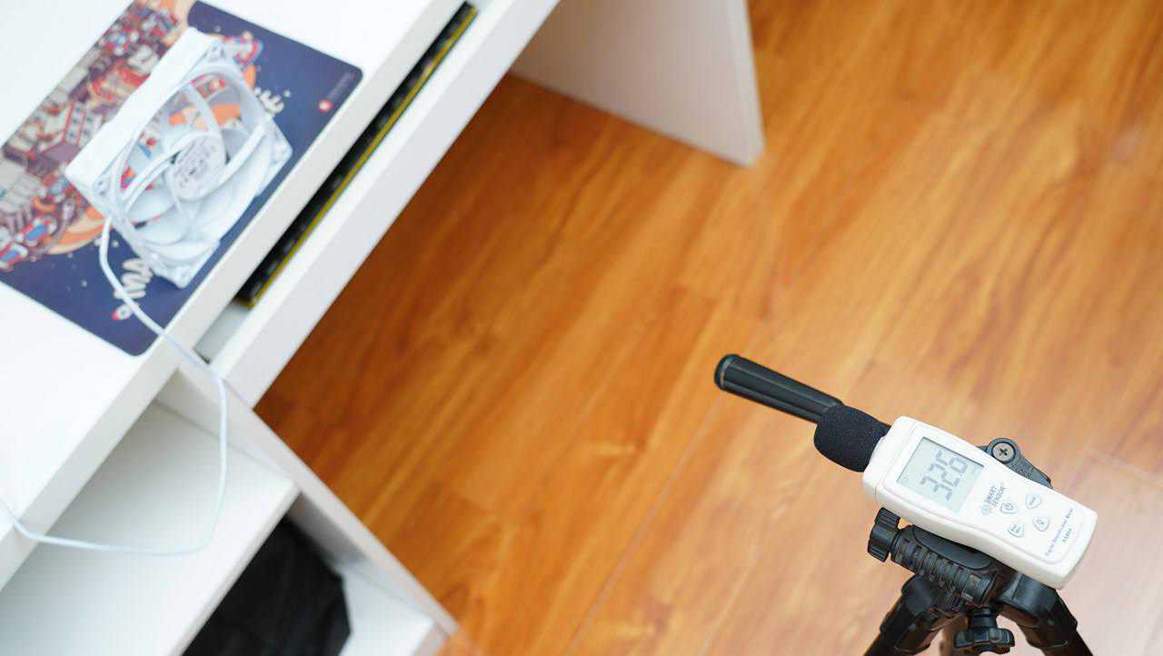 测试方法,采用分贝仪分别测试环境噪音、1200RPM(约为SILENTWINGSPRO4的M档)、1400RPM、1600RPM、1800RPM、2000RPM(约为SILENTWINGSPRO4的HS档)、2200RPM和2400RPM((约为SILENTWINGSPRO4的UHS档))时的噪音,风扇和分贝仪的距离为50CM,模拟了日常大多数人使用电脑时的场景。