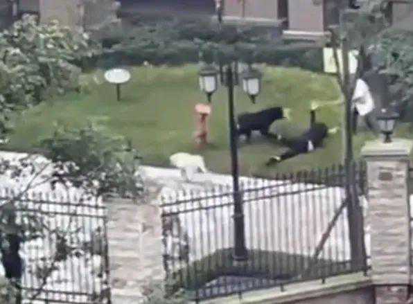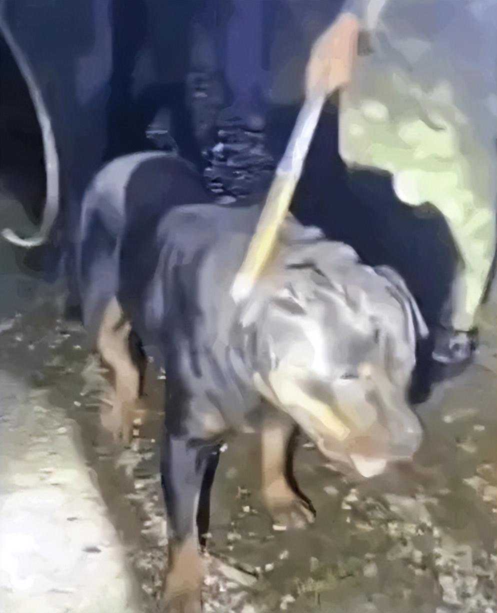 下一秒,这个饲养者不知道因为什么原因,开始用力扯着项圈,结果,不知道是有意还是无意的,项圈突然从恶犬身上脱离。