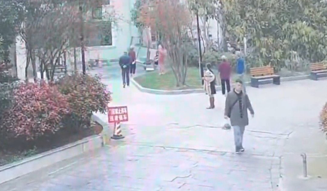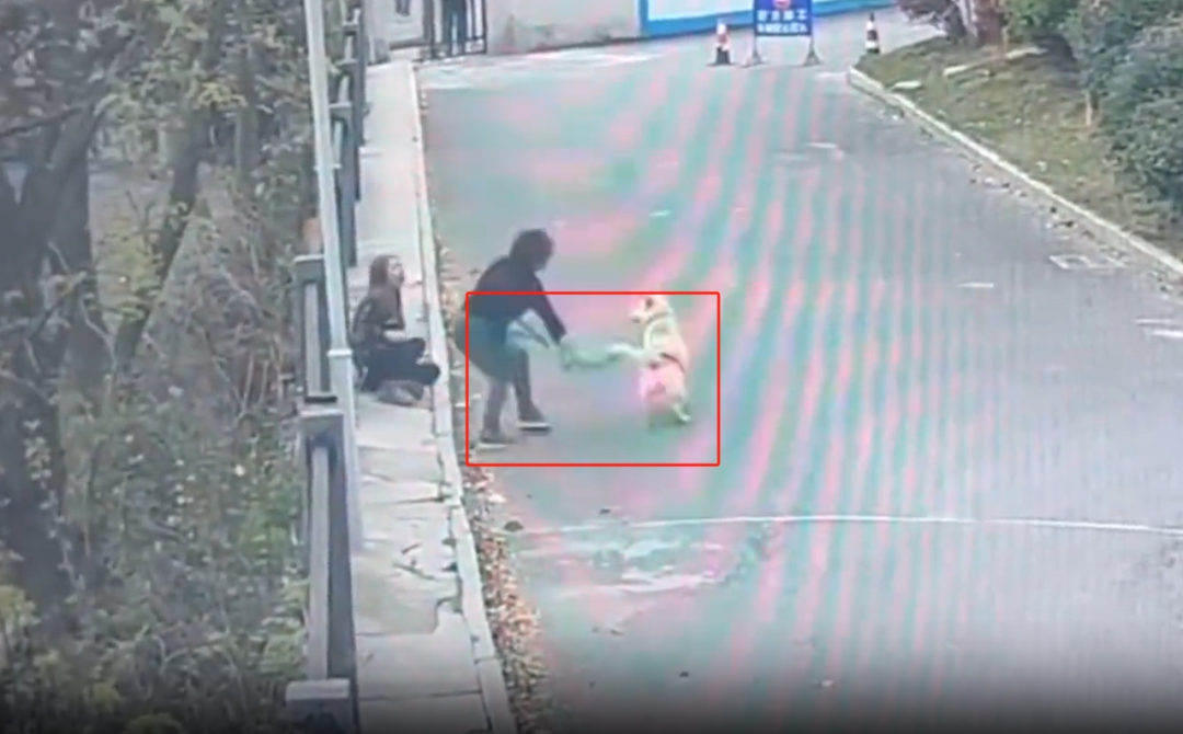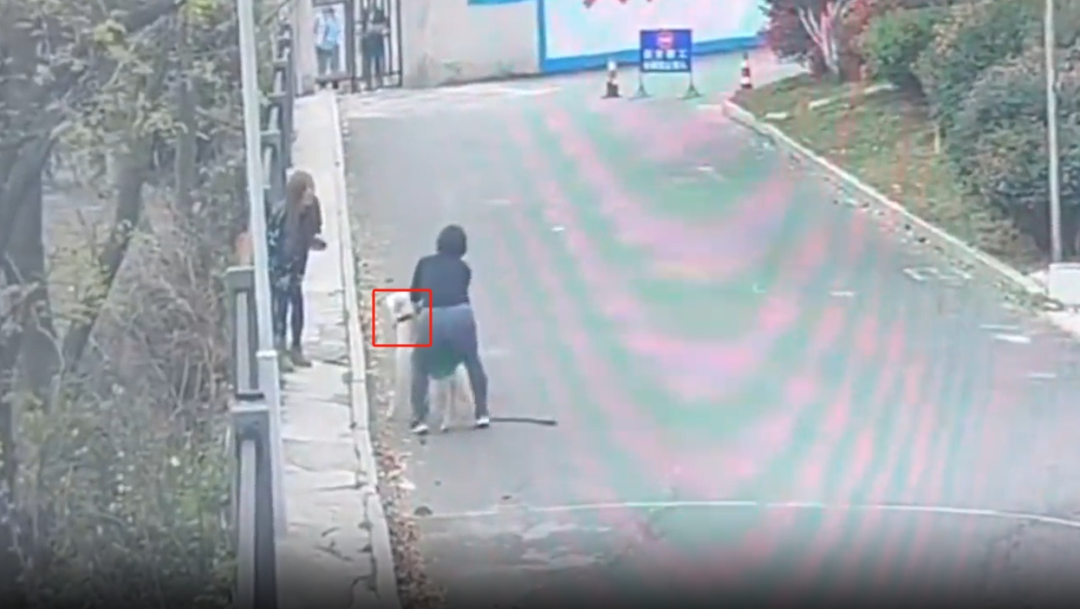 接下来,就到了事情当中最奇怪的地方,这时候,其实可以看得出来,事态是有被控制的,那个伤人的恶犬被牵引绳拴住了。