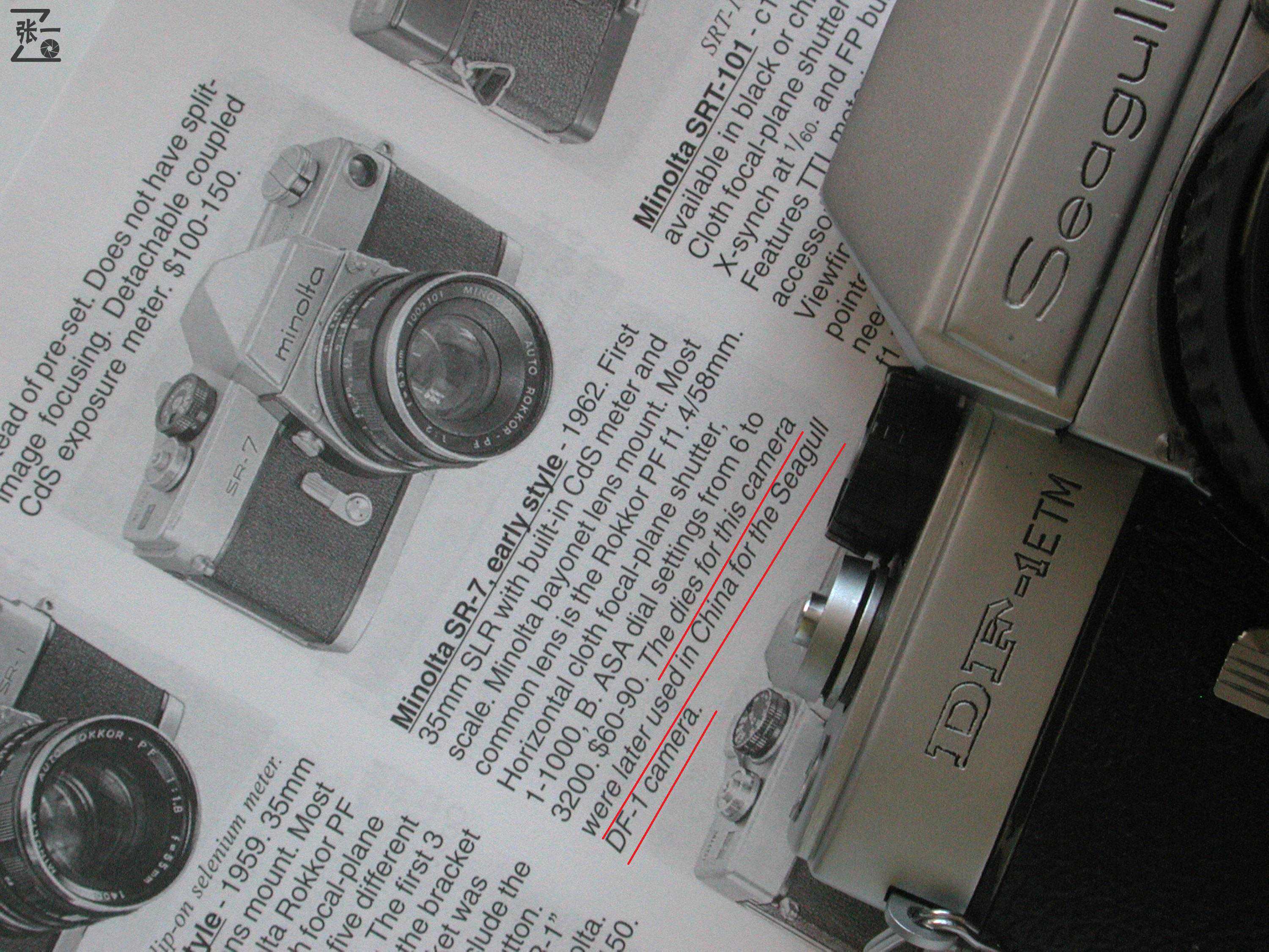 众所周知,海鸥单反相机和日本Minolta公司的产品有着很深的渊源。按照《McKeown'sPriceGuidetoAntiqueandClassicCameras》(2005-2006年版,以下简称为《价格指南》)书中有关MinoltaSR-7的介绍,“ThediesforthiscamerawerelaterusedinChinafortheSeagullDF-1camera”(下图2中红线处),翻译成中文就是“这款相机的模具后来在中国被用于制造海鸥DF-1相机。”