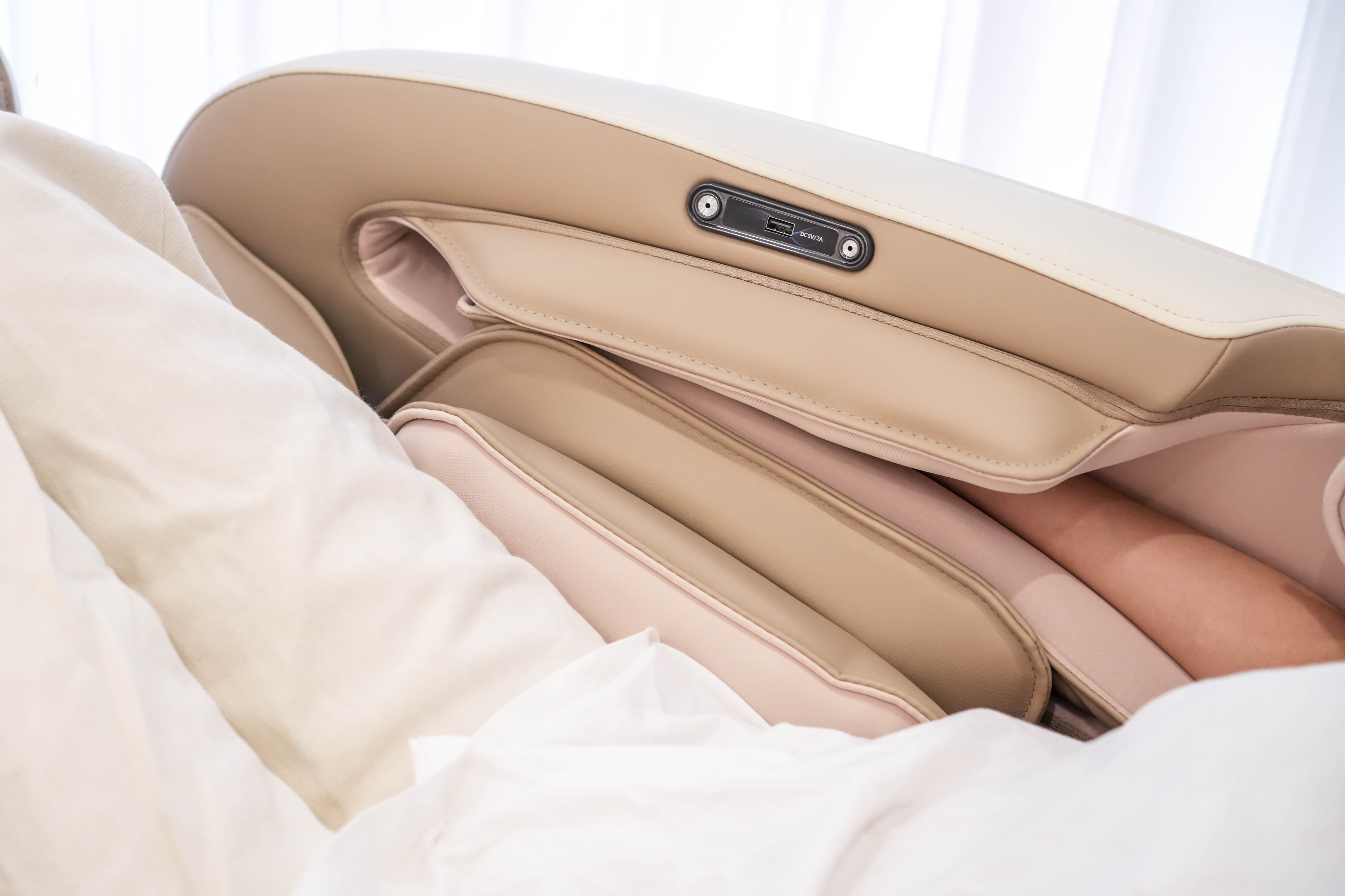 手侧配备了一个usb充电接口,希望以后能更新或者添加Type-C接口,这样或者可以更便利。不过按摩椅是摆放在家享受的,手机、平板能不能在按摩椅上充电,我觉得不值得讨论,摆放在客厅睁眼就能看大电视屏或投影才最爽。