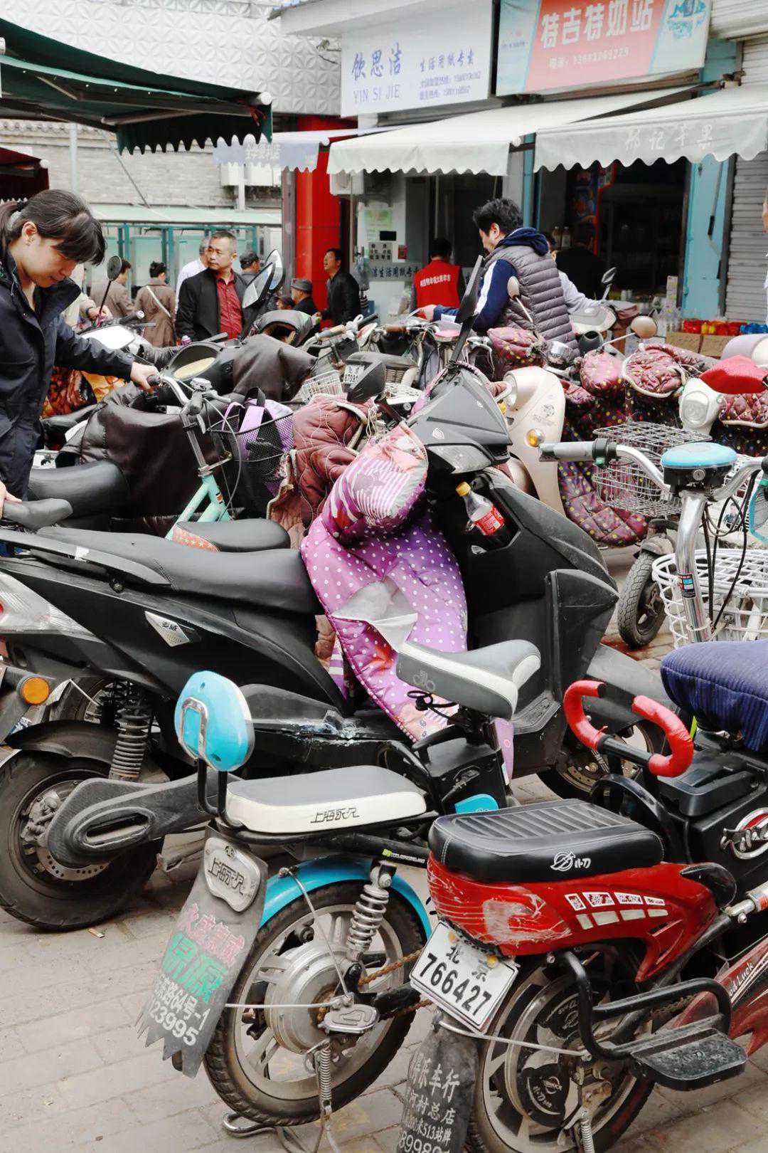 ▲南城特吉特早市儿上,有很多人骑着摩托和自行车来买菜,菜场还设了停车位。