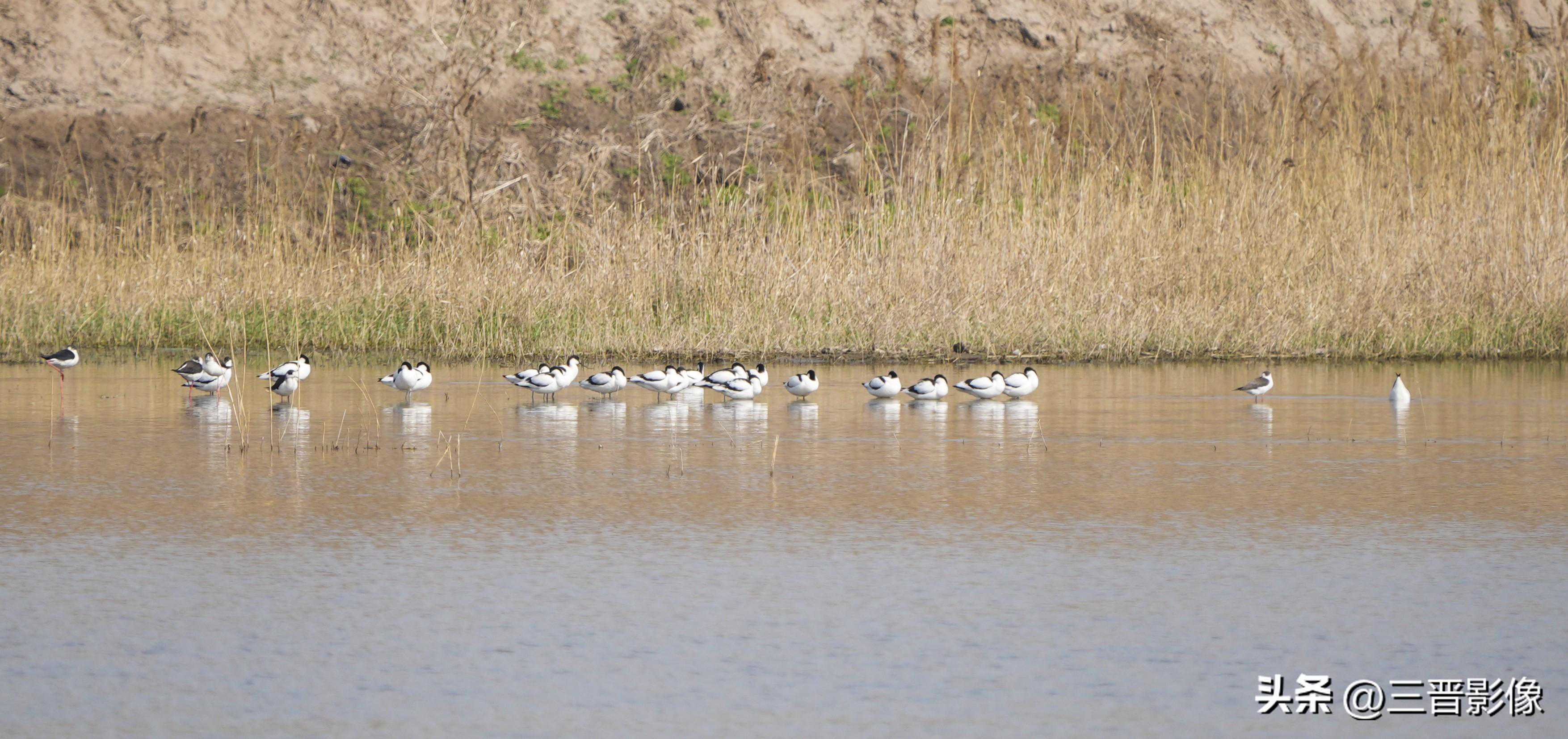 第二天上午,又专程来到了地处尧都区与洪洞县交界的洪洞县湿地公园去寻找和拍摄,到达目的地后,远远的看到了河对岸的水面上似乎有一群白色的鸟类,凭我的肉眼都难以确定这是什么鸟,所以快速掏出相机,将镜头的焦距调到了最长端拍了两张,回放一看原来是一群平日里很少见到的黑翅长脚鹬和反嘴鹬,对此虽心里高兴,但又感叹鸟儿离的太远,所用的镜头焦距太短。