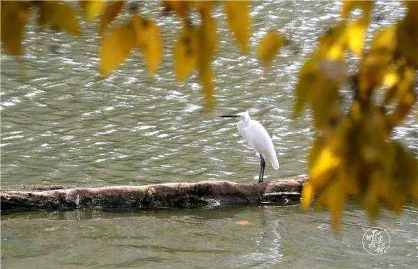白鹭或是在河面觅食或是展翅飞翔,时而向不远处的树枝上飞去,时而又盘旋飞向水面,与枝繁叶茂、黄绿相间的滇朴形成一幅生动的美景。
