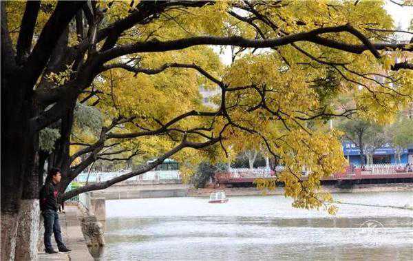 秋色斑斓,秋光明净。远远望去,小桥映在水中,随风飘落的叶子好像是一只只金蝶在翩翩起舞。映衬着秋阳的照耀,滇朴用金黄的颜色让寻美的人捕捉到最美的城市色彩。这幅昆明“最美秋景”,让你沉醉了吗?