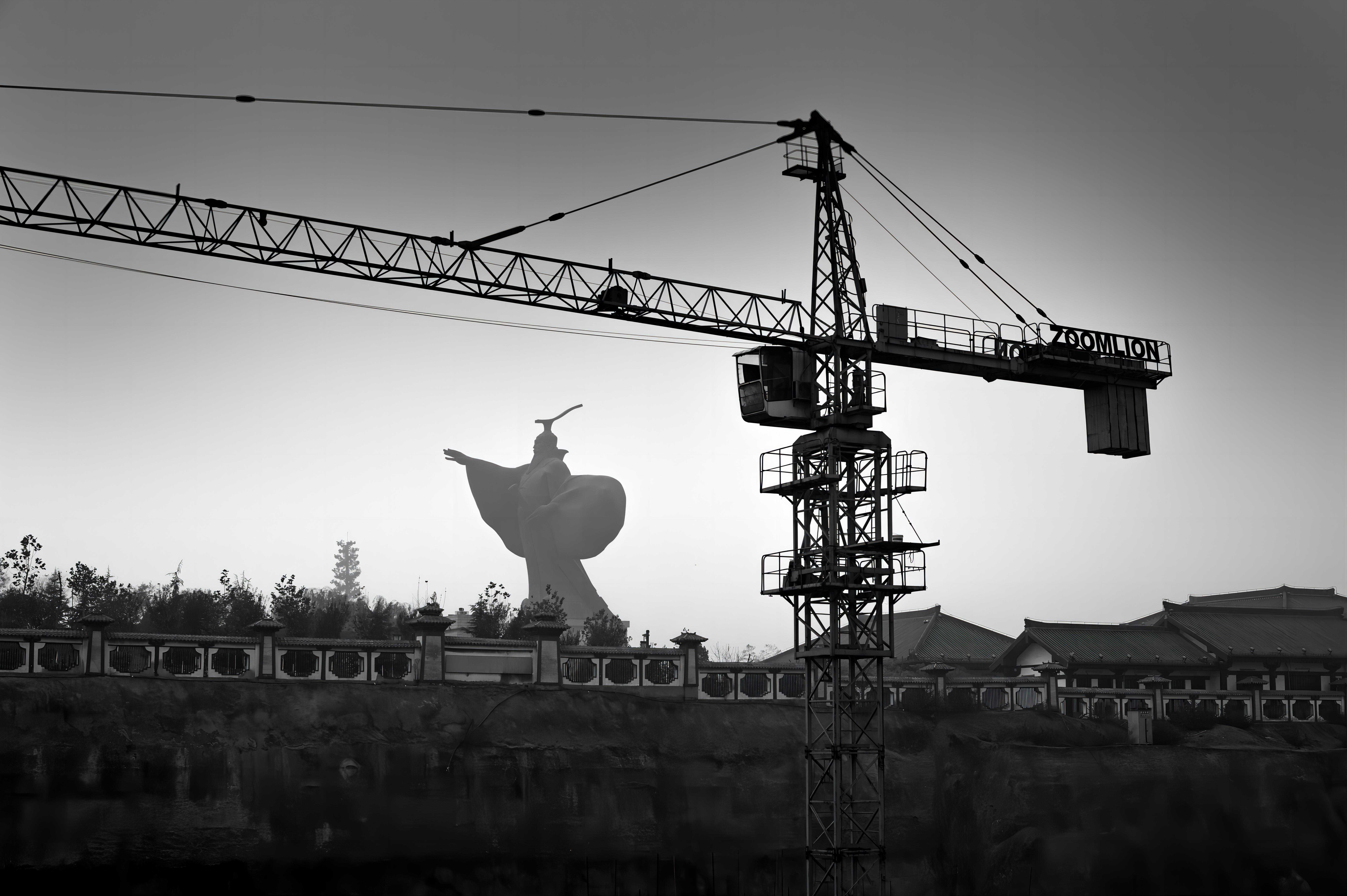 1990年代的西安,开始大规模地进行城市改造,拆迁几乎达到了一个高峰,城市进入跨越式的发展阶段。秦岭作为土生土长的西安人,手拿相机,频繁地出没于上述这些场所,为消逝的它们留下最后身影。这对于他既是出于常年拍照这个动作带来的某种习惯,也是内心潜意识的力量驱使。或许,我们可以视这些照片是一种客观记录,但同时,秦岭这一时期的影像因为城市的异动,与他之前拍摄的大量反映陕西民风民俗的作品不同,也与本地同行在内容摄取上相异——农耕文化中人的平静,开始快速地走向它的对立面——枯枝与新城、残雪与城墙、汉武大帝的塑像与脚手架、灞河老桥被拆,河床上遗留的唐代基筑桩子将被拆移到别处,四个面对这一场景的背影依旧平静,但内心笃定不再。秦岭的这些影像,让我们看见,西安人的生活转向一个全新的方向。