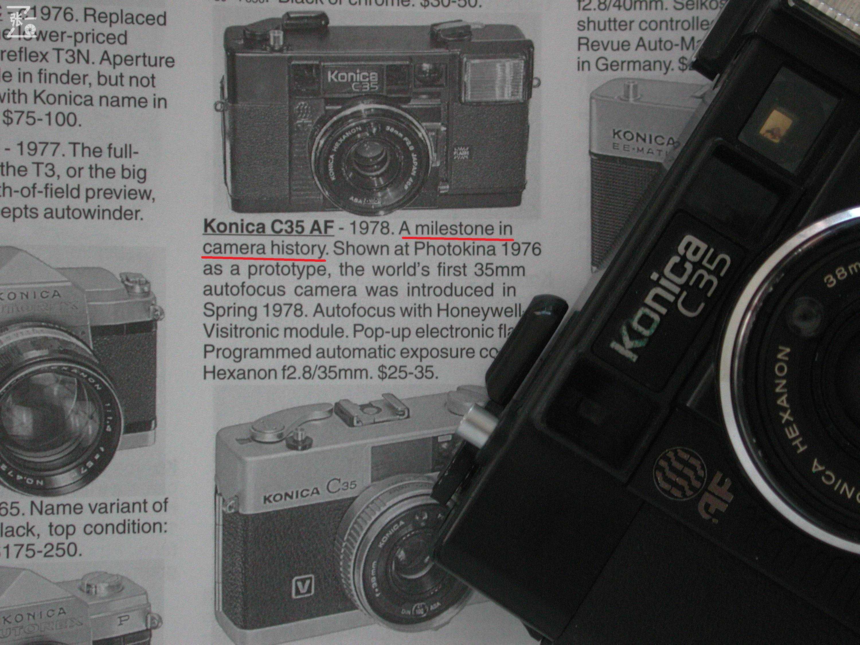 因此在我参考最多的《McKeown'sPriceGuidetoAntiqueandClassicCameras》(2005-2006年版)一书(以下简称为《McKeown价格指南》)中,这款KonicaC35AF被称为“Amilestoneincamerahistory”,中文大意就是“相机史上的里程碑”!
