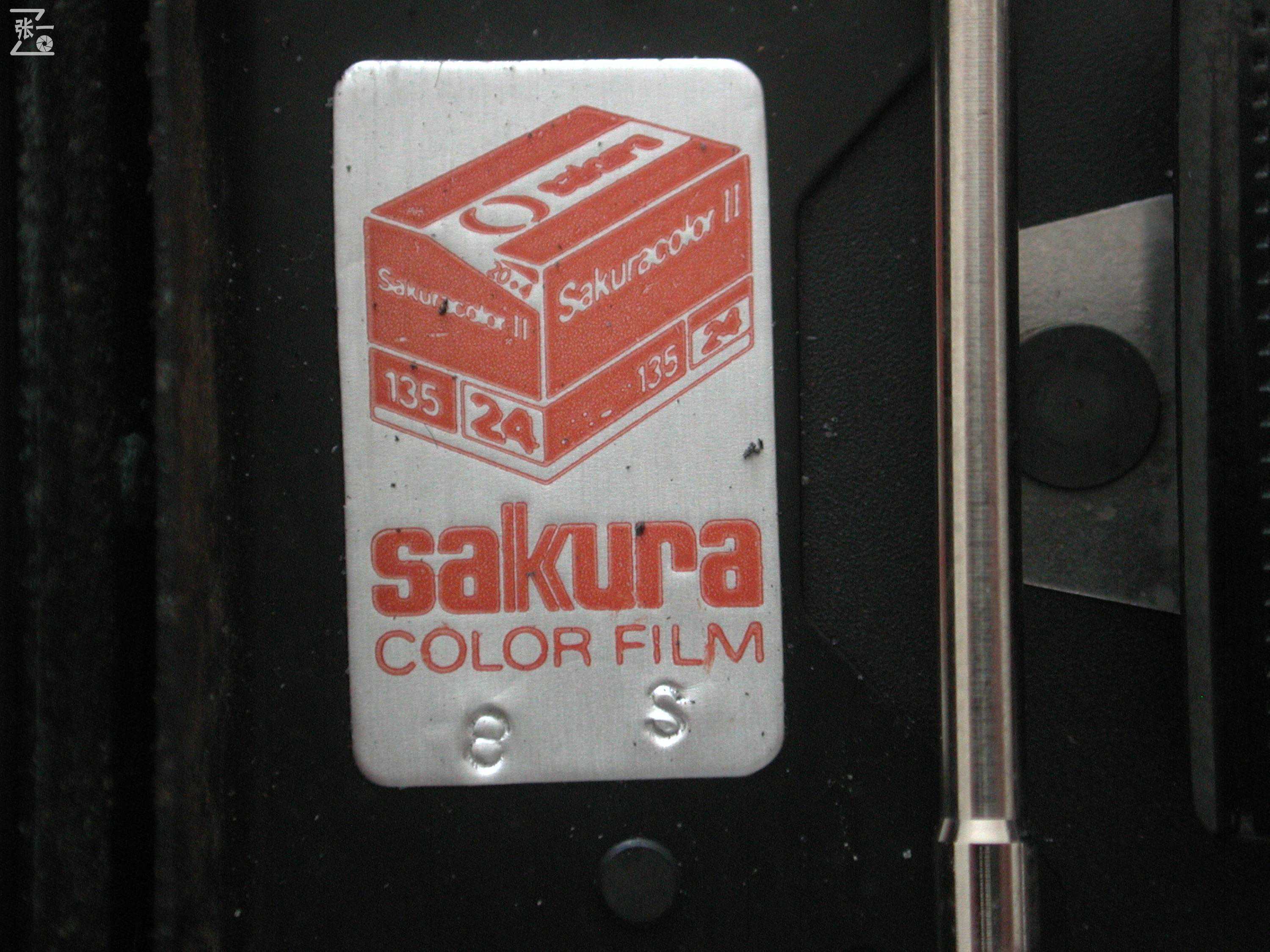 我手里这台编号为229898的KonicaC35AF的机背内侧面上,有个Sakura胶卷的贴纸,应该是为了给Sakura胶卷做推广之用。这一点,其实是很多国外既生产相机、又生产胶卷的厂家的做法,最常见的就是德国的Agfa和美国的Kodak。